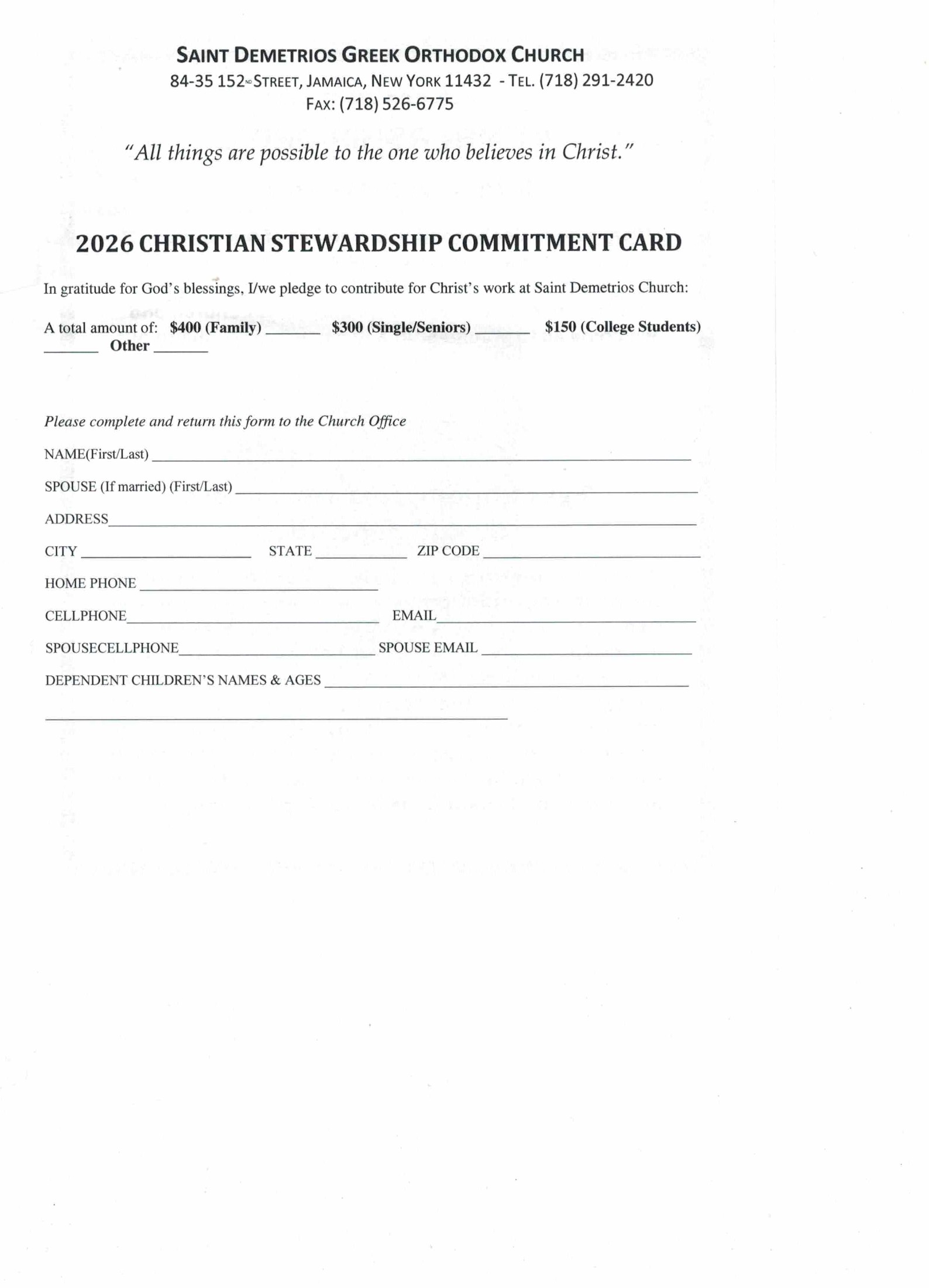 We who are involved with the life of the Church and our Christian faith are given the responsibility to sustain and preserve our faith. We are the recipients of God's gifts and play an active role in perpetuating His work of salvation. We need your prayers, love and financial support to meet the needs of our Saint Demetrios Church. Please consider fulfilling your 2026 Annual Membership Pledge.